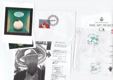 Geklammert, verschiedene Papiere, Umschläge mit Fotokopien, Originalfoto, Stempeldrucke, Collage, meist signiert und nummeriert. Cover handkoloriert mit 4 Wollfäden, in Plastikfolie und Briefumschlag, Briefmarken, Stempel