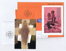 Künstlerpostkarte, beklebt mit Papier und Strukturfarbe oder Paste, A4 Kuvert, Tonpapier orange, beklebt mit Künstlerpostkarte, bestempelt